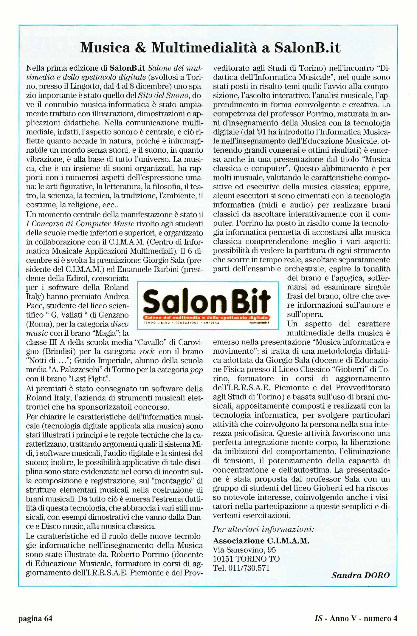 Nel dicembre 1997 compone e registra la sigla del SalonB.it (salone del multimedia e dello spettacolo digitale) presso il Lingotto Fiere di Torino e nella stessa manifestazione realizza e presenta una performance su movimento umano e musica computerizzata di propria composizione con un gruppo di allieve del liceo Gioberti di Torino. Sempre nell’ambito del SalomB.it con l’associazione C.I.M.A.M organizza il 1° Concorso di Computer Music rivolto agli studenti delle scuole medie inferiori e superiori. In collaborazione con l’amico Porrino scrive il libro “Guida di informatica musicale”.